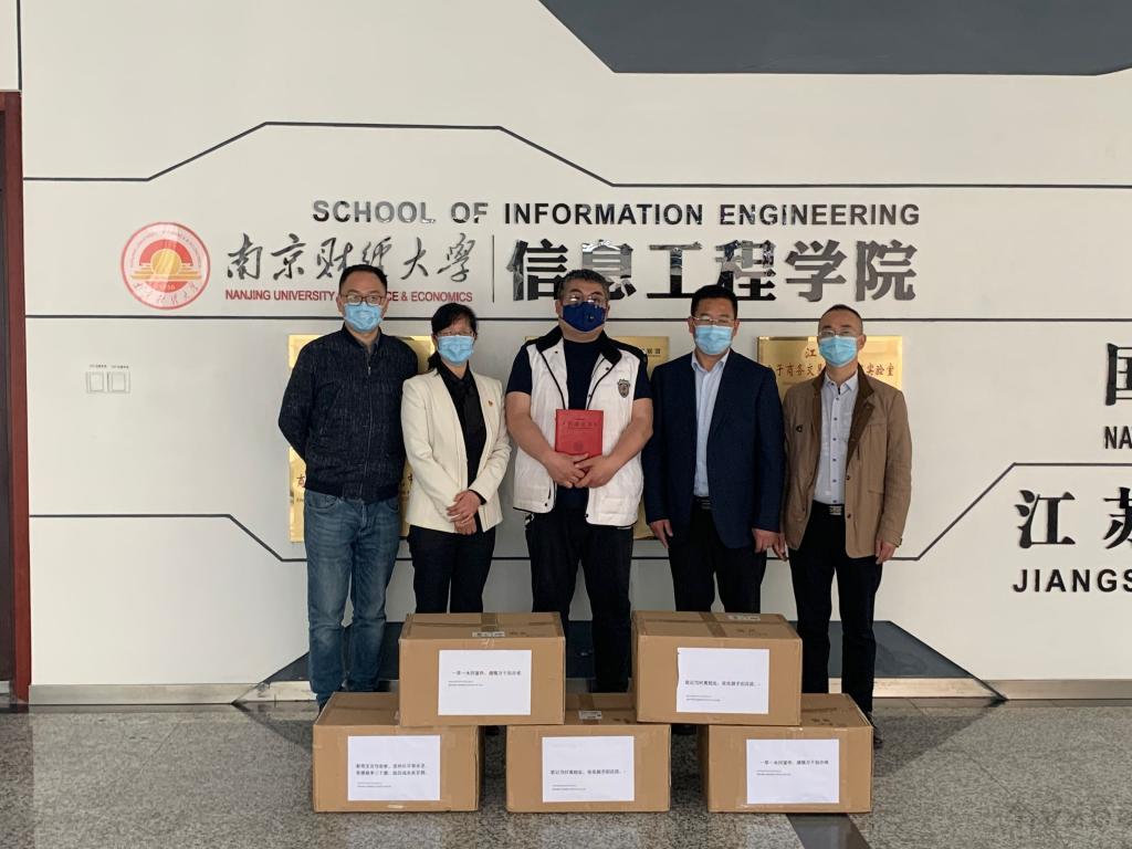 4月26日下午,我校97级校友、南京苏迈瑞尔纺织品贸易有限公司董事长陈永刚来到我校,作为企业代表向信息工程学院捐赠一万只口罩,助力我校疫情防控工作。对外联络处副处长王冲代表学校为陈永刚校友颁发了捐赠证书,信息工程学院党委书记周亚芳代表学院接收了捐赠物资。