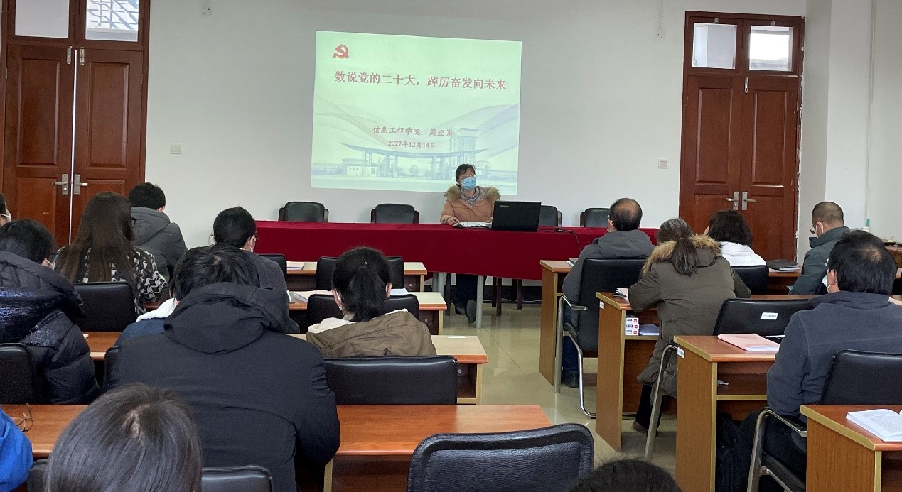 12月14日下午,信息工程学院党委书记周亚芳在德业楼406会议室,以“数说二十大,踔厉奋发向未来”为题,给全院教职工宣讲党的二十大精神。她介绍了党的二十大整体情况,并对二十大报告的“112233556”,即“中心任务、第一要务,两步走、两个行,三个务必、三件大事,五项原则、五个必由之路,六个坚持”等要点等做了详细分析,提出要按照“五个牢牢把握”“七个聚焦”的要求全面深入贯彻落实党的二十大精神。