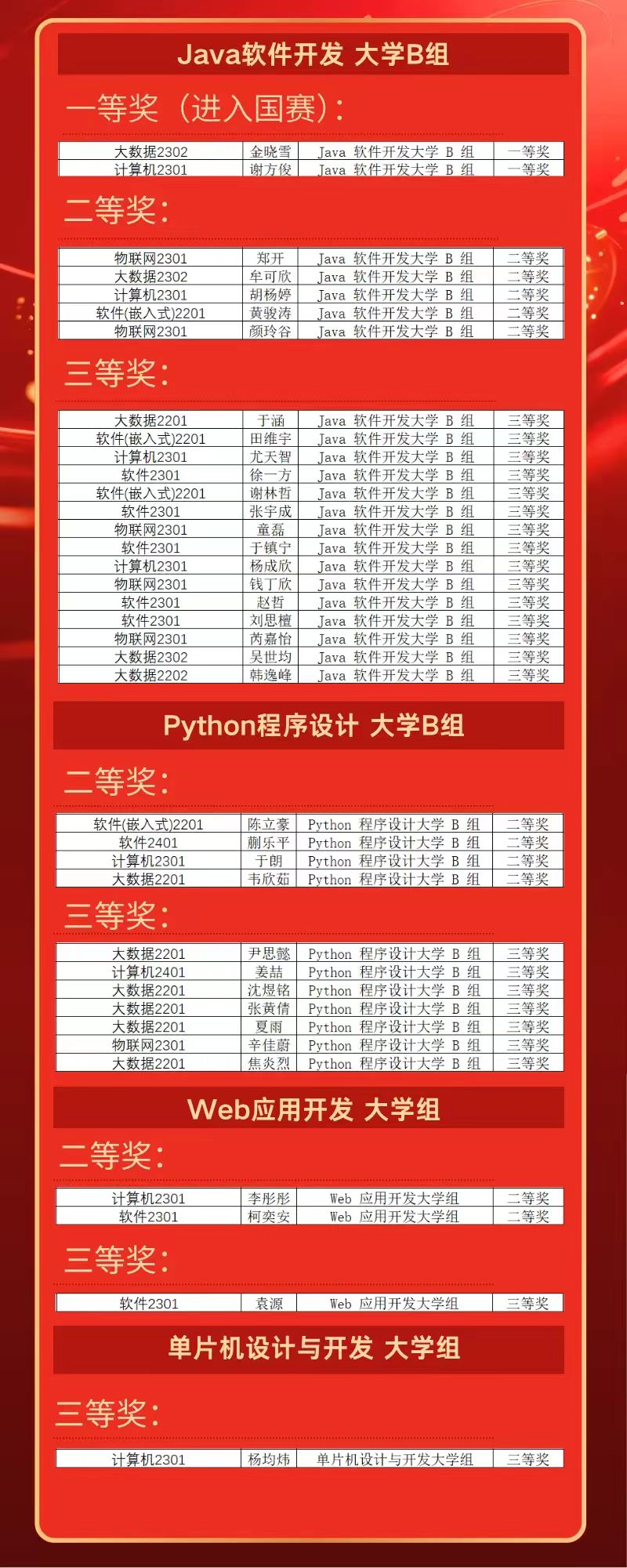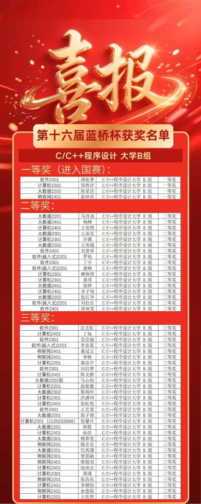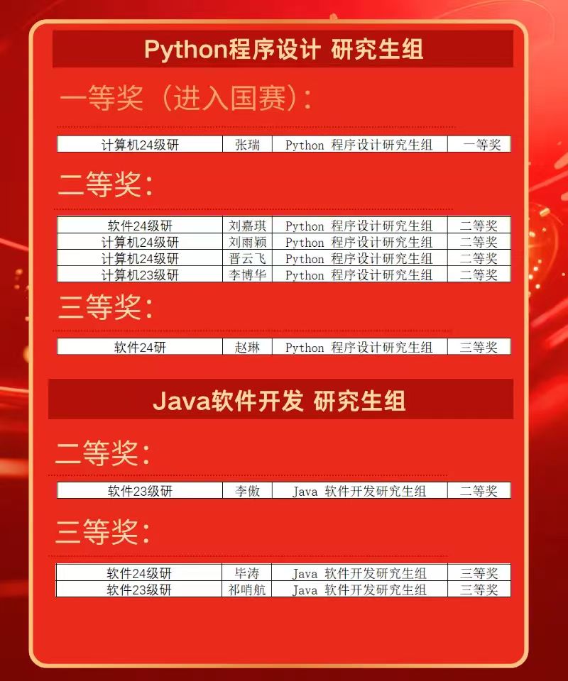 近日,第十六届“蓝桥杯”全国软件和信息技术专业人才大赛(软件赛/电子赛)省赛成绩公布,禁漫 共有100名学生获奖,其中一等奖9人、二等奖33人、三等奖58人,获C/C++程序设计大学B组一等奖的付学强、胡依梦、郑煦洋、陈星浩、郝祥淳、张轶博,获Java软件开发大学B组一等奖的金晓雪、谢方俊,以及获Python 程序设计研究生组一等奖的张瑞晋级国赛。