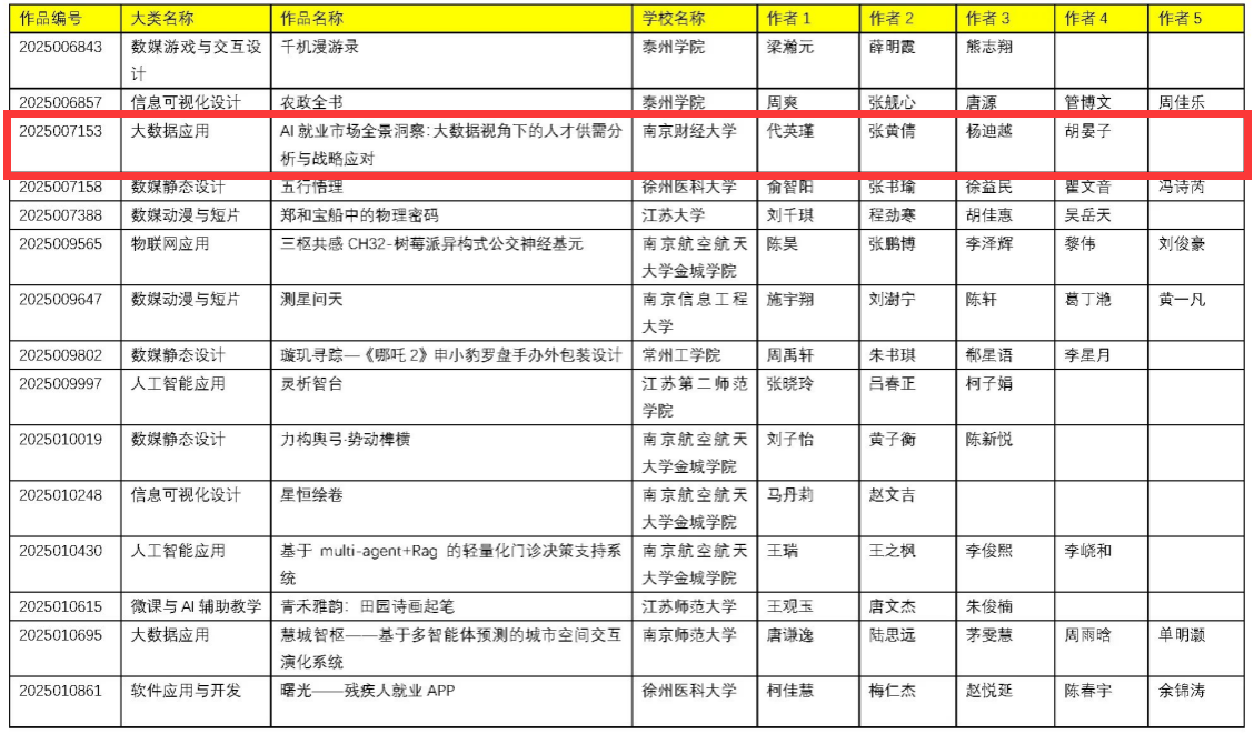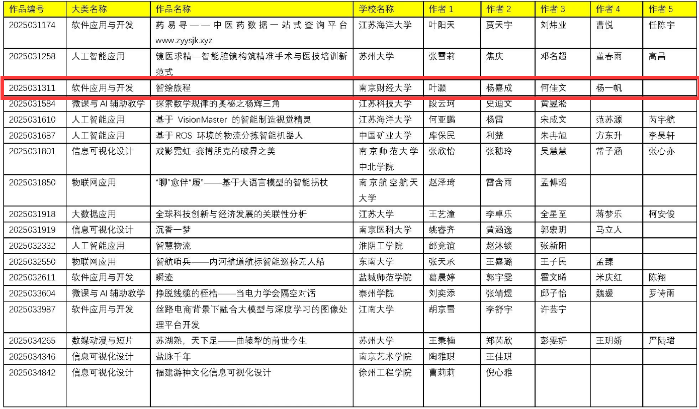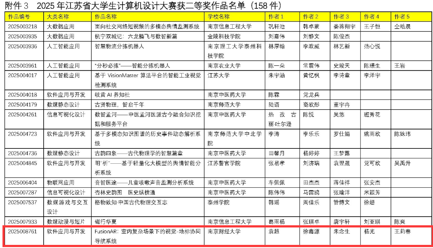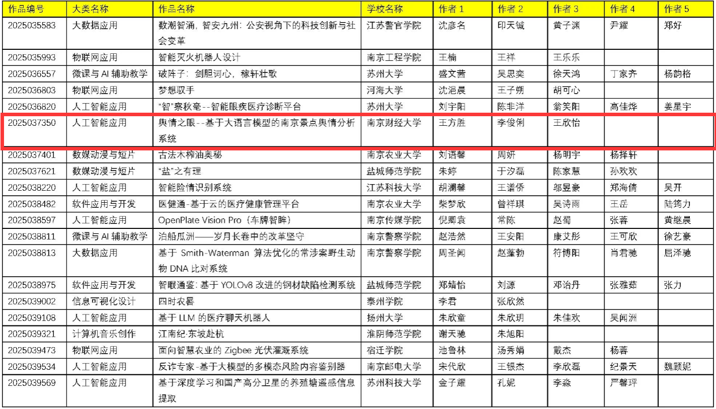 袁超、徐鑫源、朱念生、杨光、王莉春同学的《FusionAR:室内复杂场景下的视觉﹣地标协同导航系统》(指导老师:朱利涛)项目斩获二等奖,晋级国赛;王方胜、李俊俐、王欣怡同学的《舆情之眼——基于大语言模型的南京景点舆情分析系统》(指导老师:朱桂祥)、代英瑾、张黄倩、杨迪越、胡晏子同学设计的《AI就业市场全景洞察:大数据视角下的人才供需分析与战略应对》(指导老师:蒋伟伟)、 叶灏、杨嘉成、何佳文、杨一帆同学创作的《智绘旅程》(指导老师:李树青)获得三等奖。这些作品选题新颖,紧密结合人工智能、大数据等前沿技术,展现了解决实际问题的创新思路,充分体现了禁漫