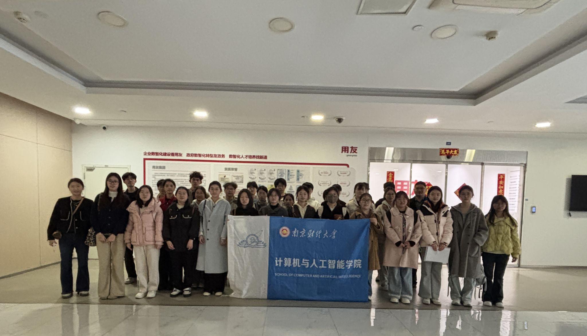 在用友网络科技股份有限公司江苏分公司人力资源部区域总监蔡菊屏的陪同下,师生一行先后参观了企业数字体验馆与办公区域,全方位了解用友自 1988 年成立以来的发展历程、核心业务布局,以及企业在云服务、软件研发、数字化平台建设等领域的创新成果。作为国内领先的企业管理软件与服务提供商,用友深耕企业数字化转型领域多年,不仅在技术研发上持续创新,更在人才培养、体系建设方面投入大量资源,为行业培育了大批专业人才。
