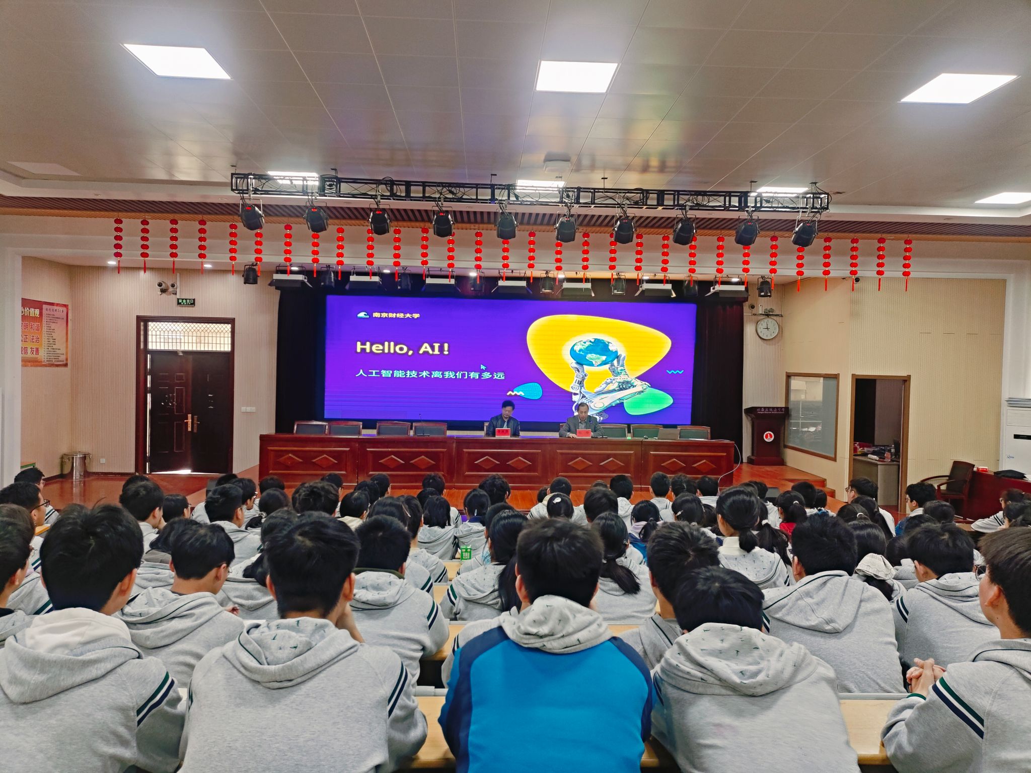 座谈结束后,系列宣讲与讲座活动有序开展。学院党委副书记马健面向四所中学的学子,全面解读了我校的招生政策,从办学特色、专业设置、学科布局、师资力量、校园文化、就业前景等方面展开介绍,重点讲解了往年专业组设置、录取分数等学子及家长关心的核心问题,让同学们对我校有了更全面、更深入的了解。随后,李树青副院长带来题为《人工智能技术离我们有多远》的“双高”金课讲座。讲座以“什么是AI”为切入点,用贴近中学生生活的生动案例,通俗拆解大语言模型、推荐系统等前沿AI技术,带领同学们一步步揭开人工智能的神秘面纱。现场氛围热烈活跃,同学们认真聆听、积极思考,提问环节中踊跃举手、主动交流,与大学老师面对面探讨AI相关疑问,在互动中深化对AI技术的认知,真切感受到人工智能与日常生活的紧密关联,进一步激发了对科技探索的兴趣。