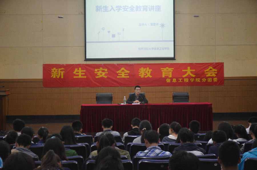 2015年10月13日晚上,信息工程学院在仙林校区管理学科楼报告厅为2015级新生举办安全教育知识讲座,由院党委副书记潘雪峰老师主讲。