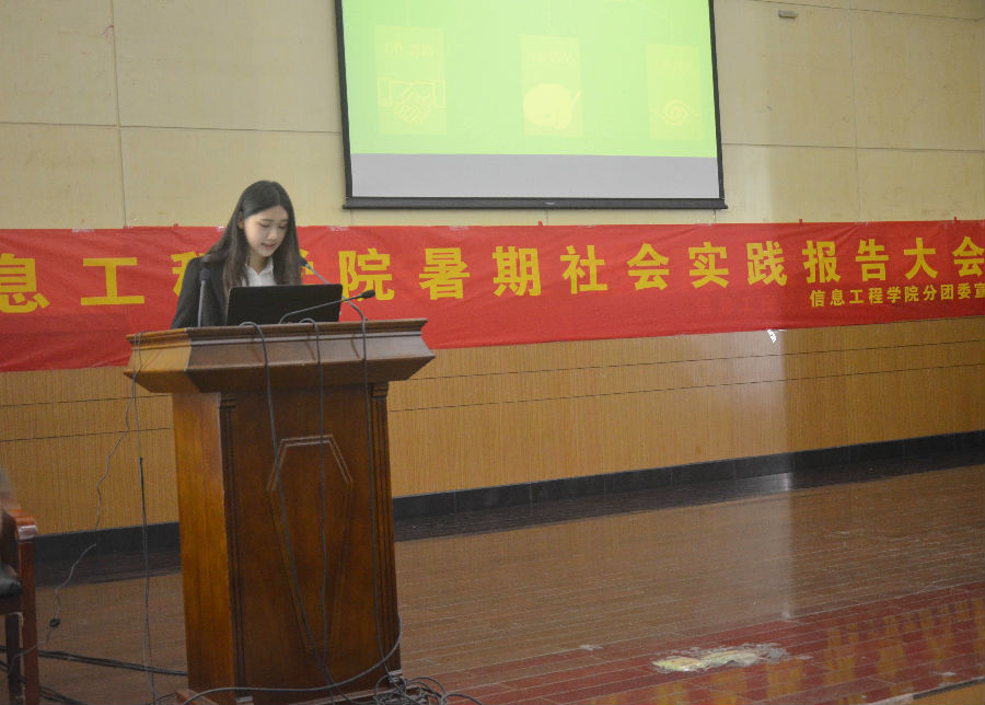 活动伊始,分团委副书记把冰倩同学向大家介绍了信息工程学院今年暑期社会实践的总体情况。接下来,分别有四支院级立项团队的代表与三位分散实践的个人上台发言,向同学们分享了自己在社会实践活动中的宝贵经历和感受。