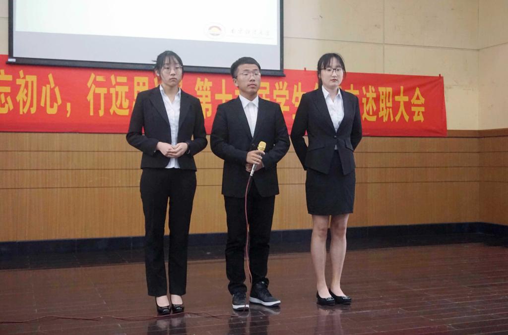 接着,主持人介绍述职大会流程,公布了各部门述职顺序,注意事项以及评选细则,紧接着便是九个部门依次进行述职答辩,学生会主席和辅导员倪青青老师对各部门组织的工作进行点评,总结,提问。