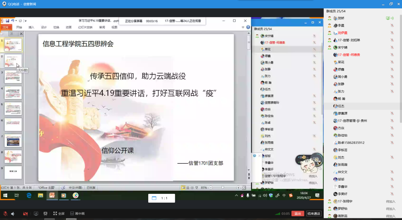 五四前夕,为信息工程学院分团委在校团委的指导下,在全院团员青年中组织开展“让青春为祖国绽放”网上主题团日活动,学院大一、大二、大三、研究生团支部共有学生718名,参与团课人数为703名,参与率为97.9%。各团支部在组织学生观看后都撰写了新闻稿作为本次学习网上主题团课的总结,在学习过程中同学们纷纷发送弹幕“五四精神,传承有我”。通过本次网上团课的学习,同学们意识到五四运动以来,一代又一代的先进青年走在时代前列,在实现中华民族伟大复兴的旗帜下,凝聚起了砥砺迸发、艰苦奋斗的精神力量。广大的青年团员更应创造自己的独特价值,实现青年自身的进步。