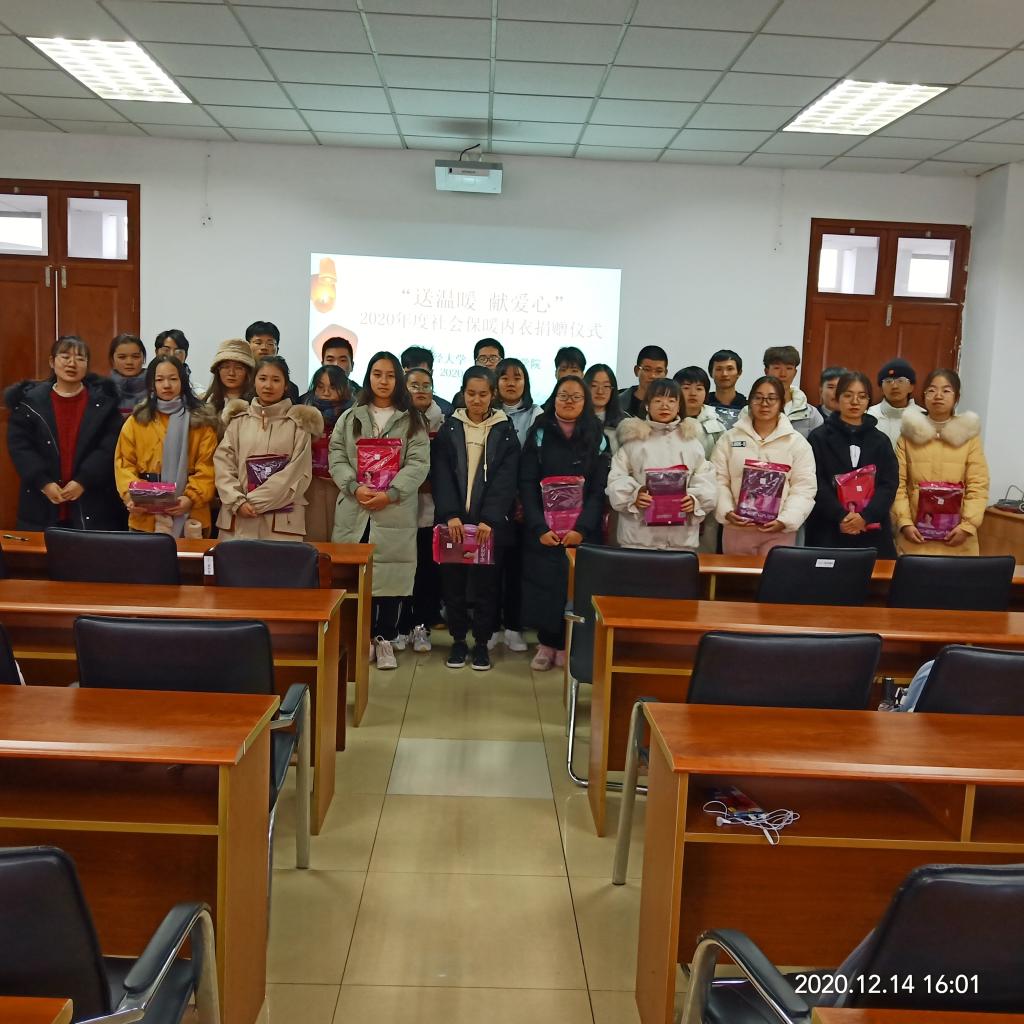 大地有阳光,万物有温暖;信工有暖意,大家过暖冬。12月14日下午,禁漫 贴心为家庭经济困难的学生们送上暖冬衣物,在德业楼406温情举行了“送温暖,献爱心”2020年度社会保暖内衣捐赠仪式,仪式由刘芳老师主持,全体受助学生参加。