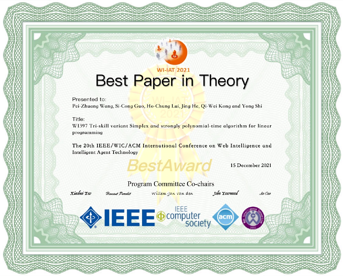 此次会议上,我校信息工程学院研究生孔七威参与写作的论文荣获国际网络智能会议最佳论文奖,以表彰其论文在理论方面对于当前数学难题有望取得启发性突破。该论文在我校信息工程学院院长曹杰教授与何静教授的联合指导下完成,论文题目为:Tri-skill variant Simplex and strongly polynomial-time algorithm for linear programming(单纯型法的三种变体技巧及线性规划的强多项式时间算法)。线性规划是否存在强多项式时间算法一直是一个跨世纪的国际数学问题,其位列著名的Smale世纪难题之列,对该问题的突破将是一个重大的理论性创新,也将为人工智能发展所面临的逻辑推理危机带来一定的理论性支撑。为了突破此难题,该论文基于前人的研究基础,提出了三种不同算法变体,该文提出的方法有望帮助线性规划研究者建立强多项式时间算法。此外,论文还提出了三种算法结合的优化方法,该方法可能将为线性规划问题的计算提供更简单的解决思路。该论文预印本已在arXiv.org数据库公开发表。