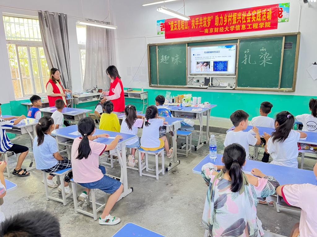扎染作为一种古老的染色工艺,在纺织品装饰和艺术创作中具有独特的地位和价值。支教团队向孩子们介绍了扎染的起源和历史背景,让他们对这一传统技艺有了更深入的了解。接着,孩子们学习了扎染的方法,包括折叠、扎花和使用橡皮筋进行结、系、捆、绑等多种形式的组合。