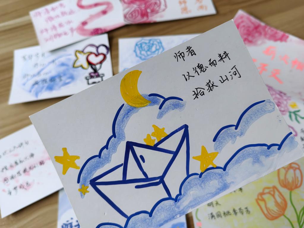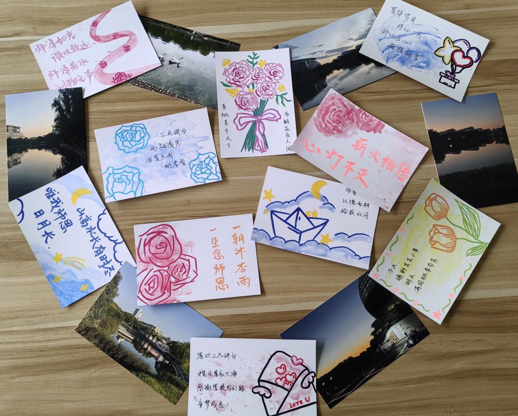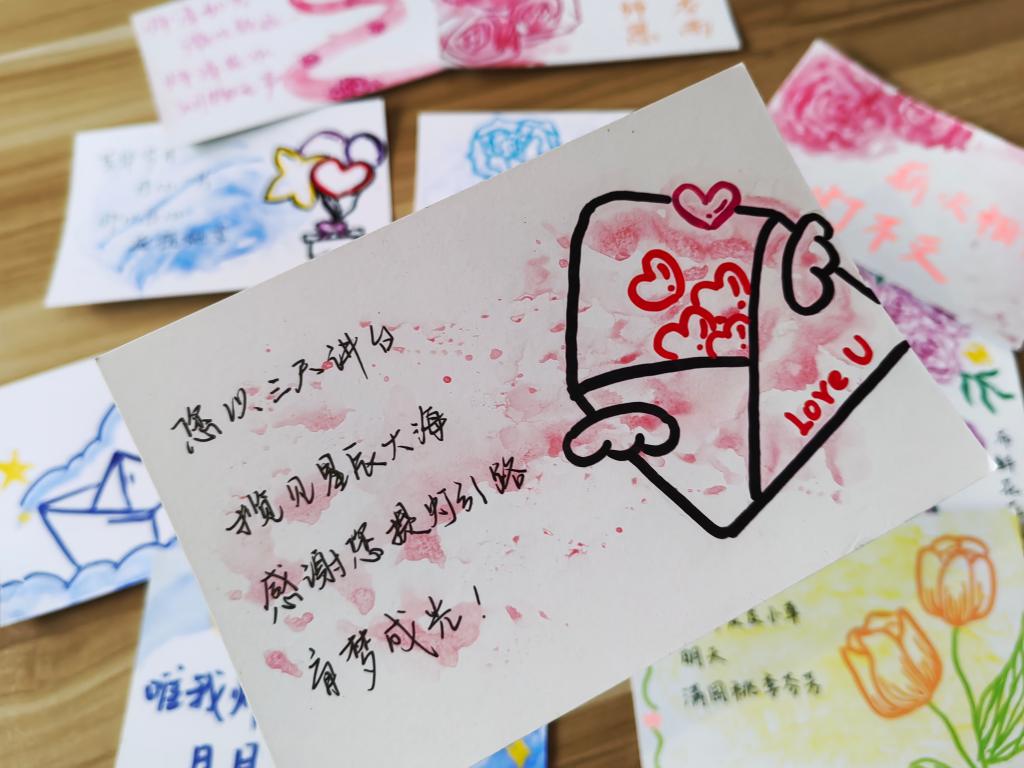 志愿者们用心绘制每一张明信片,每一句祝福,希望能够将自己的感激和祝福通过文字与绘画传递给老师们。“老师,您是我人生路上的指南针,感谢您的教导和陪伴。”“亲爱的老师,您的辛勤付出无法言表,希望您健康快乐,永远年轻!”志愿者们将自己的明信片交到老师手中,表达自己最真挚的情感。