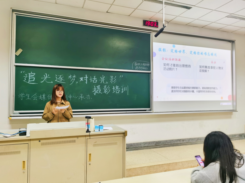 为提高学院团学活动照片质量,10月27日,信息工程学院在德业楼111开展 “追光逐梦,对话光影”摄影培训会。本次培训会由学院学生会媒体融创中心志愿者陆怀湘主持,校青媒影像制作部孔欣雨主讲。