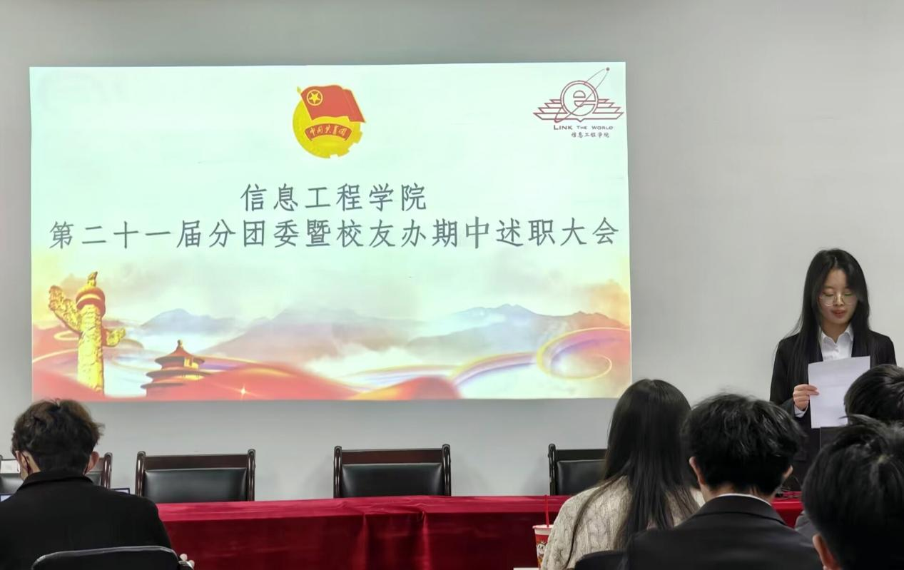 为总结信息工程学院团委、校友办本学期工作情况,促进部门间工作交流, 12月18日,信息工程学院于德业楼406会议室举办第二十一届分团委暨校友办中期述职大会。院团委陈鑫老师,学生书记张璇、龙文雪,校友办副主任曹陆骁、邹宇出席会议,院团委、校友办全体成员、各团支部书记参会。