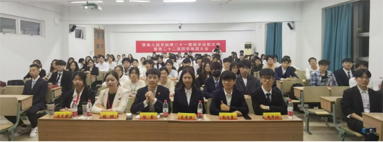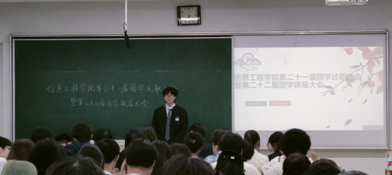 近日,信息工程学院在博文楼201教室举行第二十一届团学述职大会暨第二十二届团学换届大会。信息工程学院团委老师陈鑫出席会议,学生会主席团黄泽阳、张佳豪和吴孝烨、分团委副书记张璇和龙文雪,会计学院主席丁瑾、经济学院主席朱思秒、外国语学院主席钱盈盈和陈思彤、法学院主席王竹、学生会成员、分团委成员、各班学生代表以及各团支部代表参与会议。