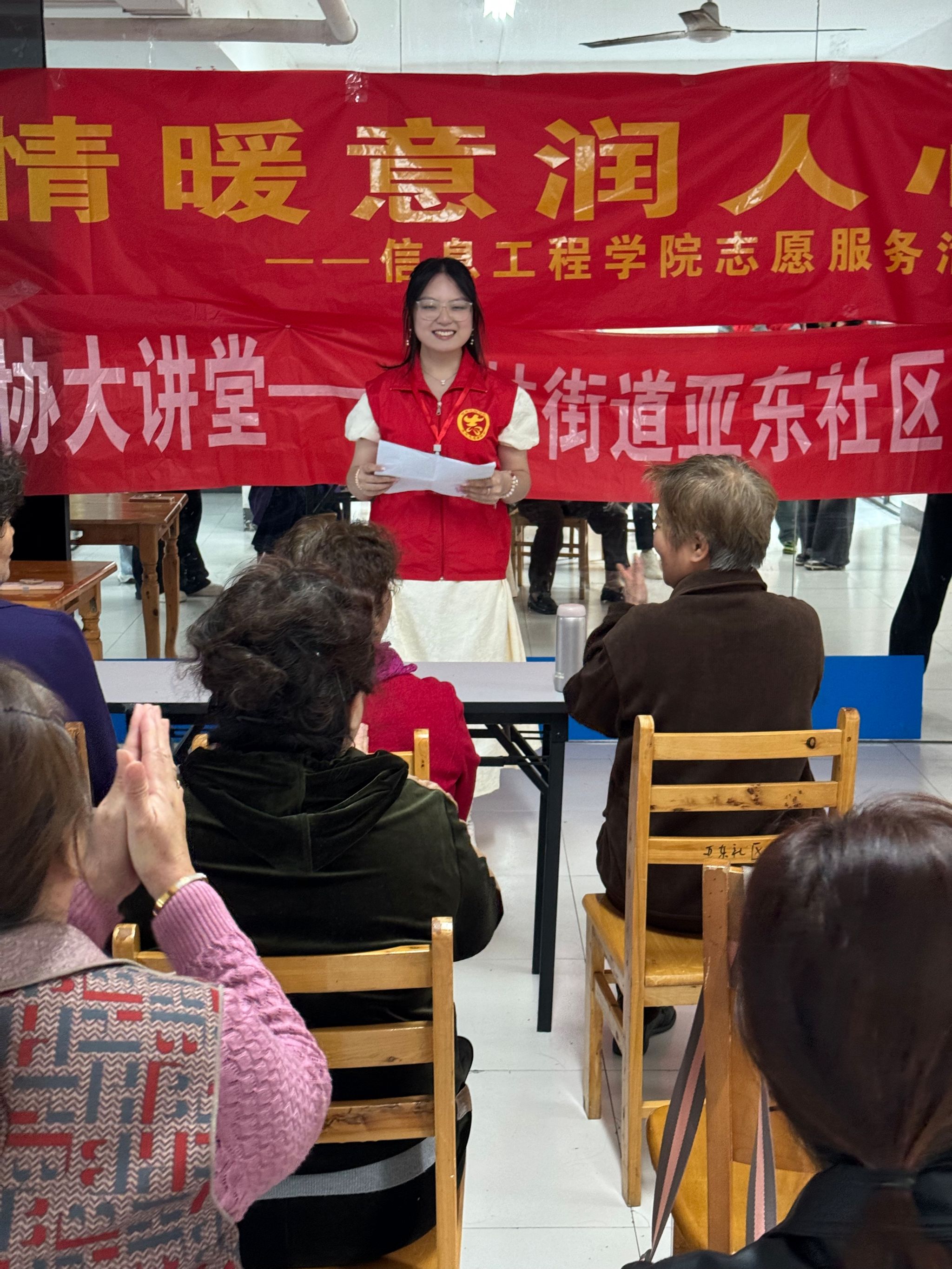 信息工程学院在瑞金新村党群服务中心成功举办了“心系桑榆,情暖金秋”主题的尊老敬老志愿活动,志愿者们不仅将关爱与温暖送给了老年人,也为代际沟通障碍的解决与社会和谐的发展贡献了力量。