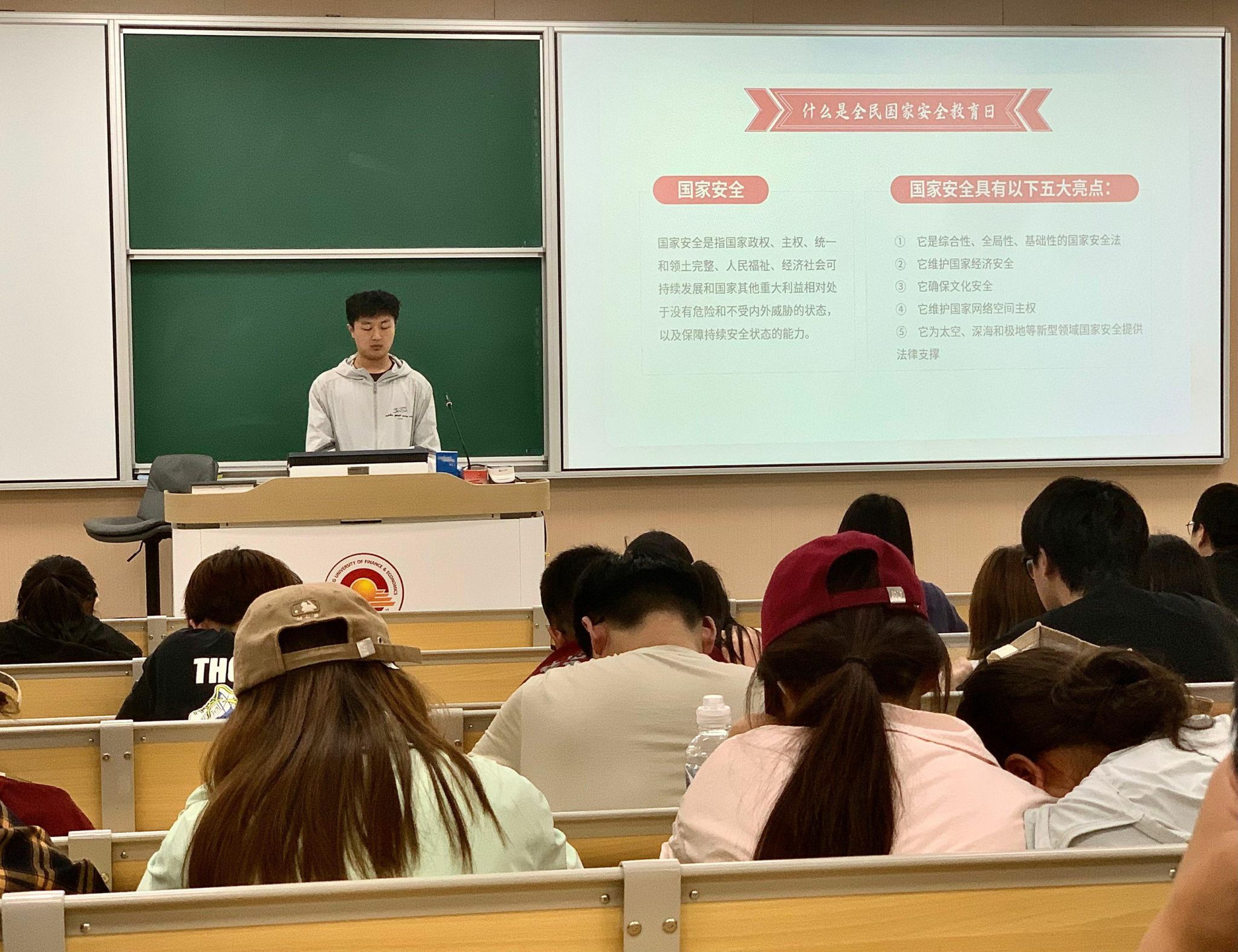 在接下来的过程中,主持人围绕国家安全的基本概念、丰富内涵与重要意义展开深入讲解,从定义出发并结合当前国际国内形势,系统阐述了国家安全不仅包括传统的国防安全,还涵盖网络安全、生态安全、生物安全等多个领域。通过深入浅出的分析,同学们对国家安全的系统性和复杂性有了更清晰的认识。