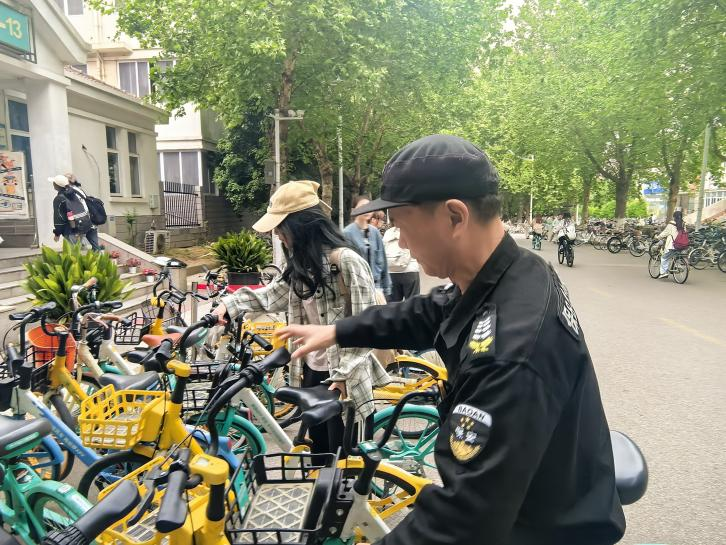 周梦希与保安大叔一起检查校园安全隐患、整理共享单车疏通道路