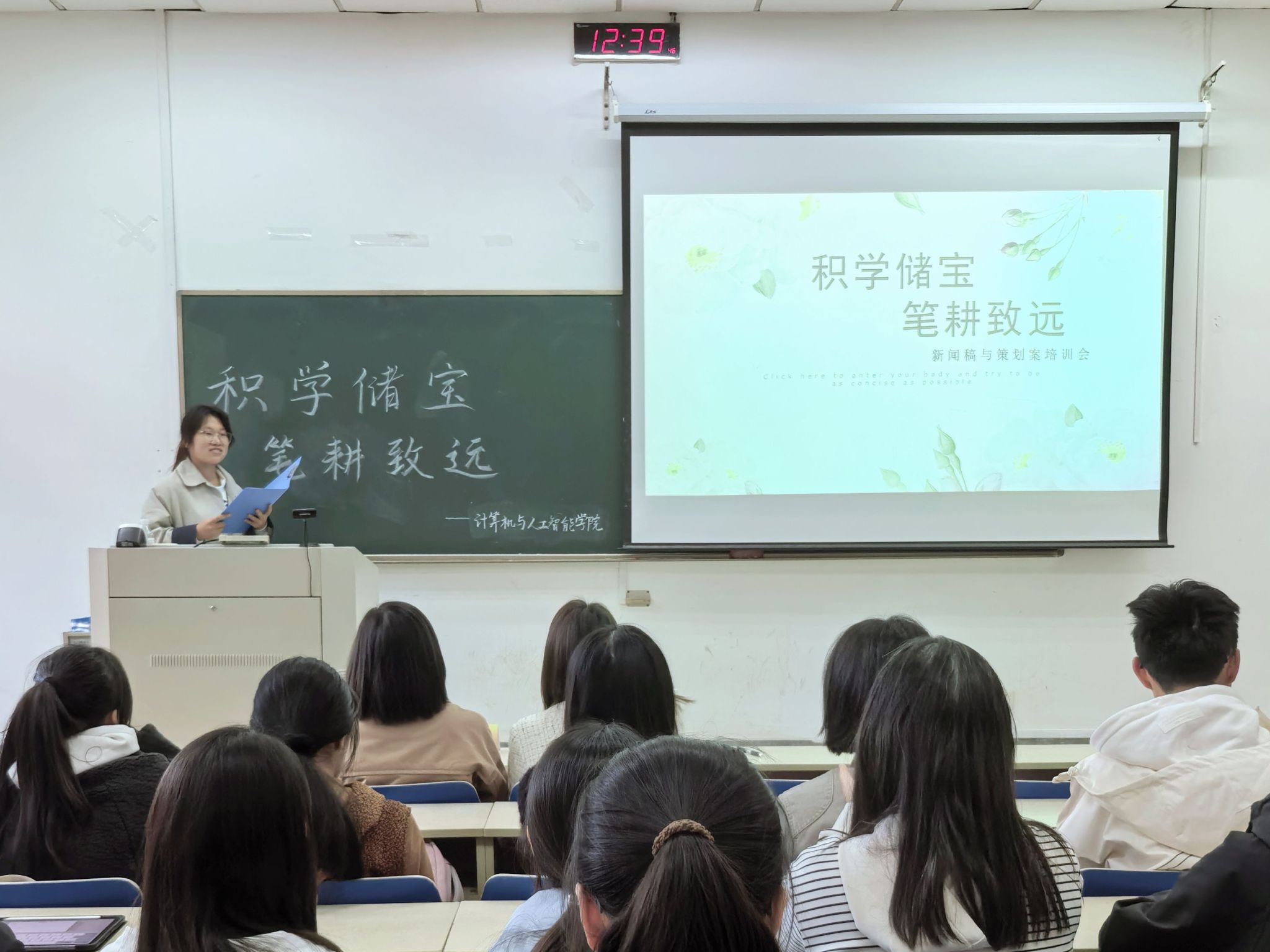 于10月22日在专四108教室举办了以“积学储宝,笔耕致远”为主题的新闻稿与策划案培训会。培训会特邀校党委宣传部禁漫主任施卫娟老师主讲,禁漫