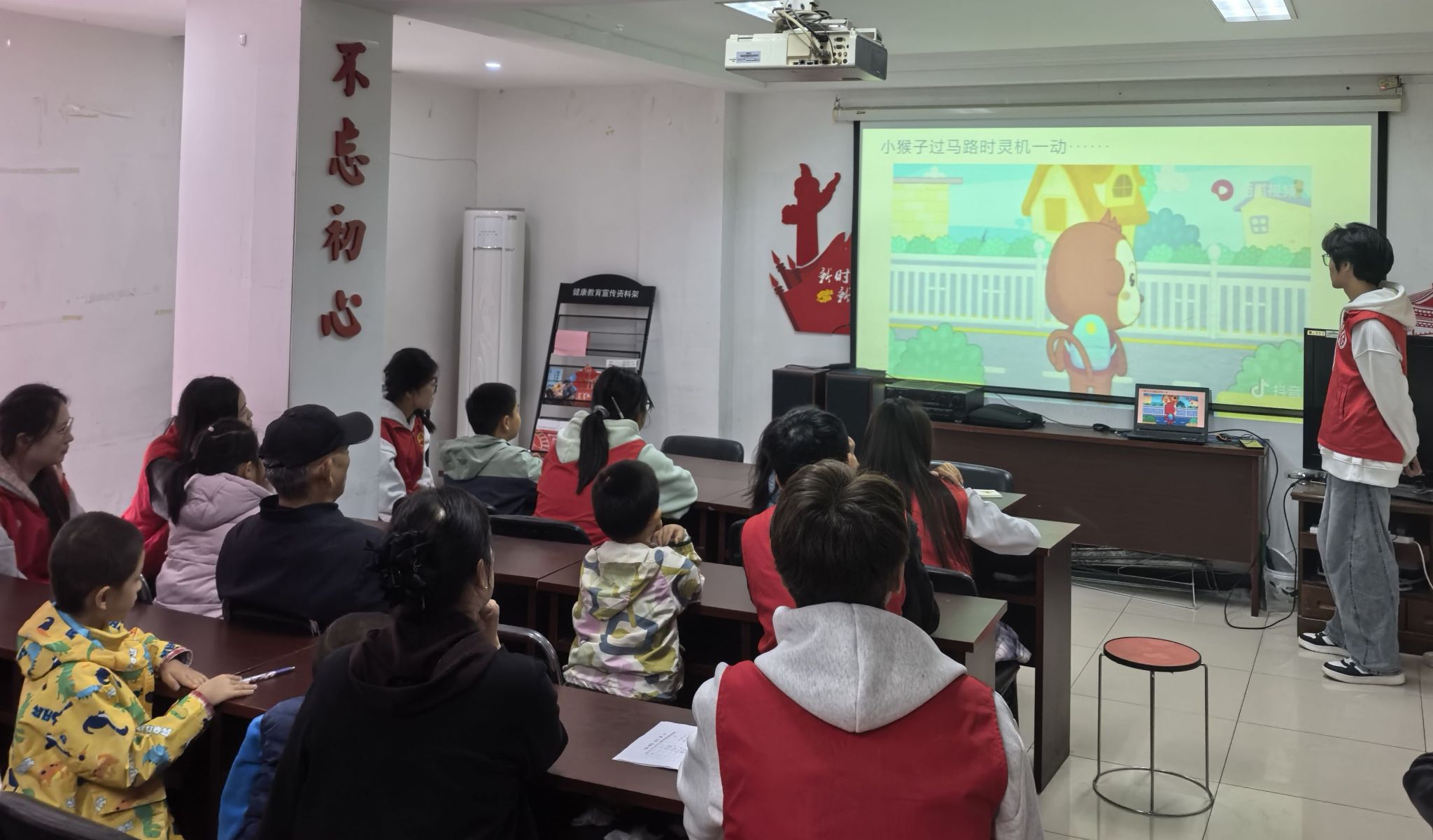 志愿者为小朋友们播放安全科普短片