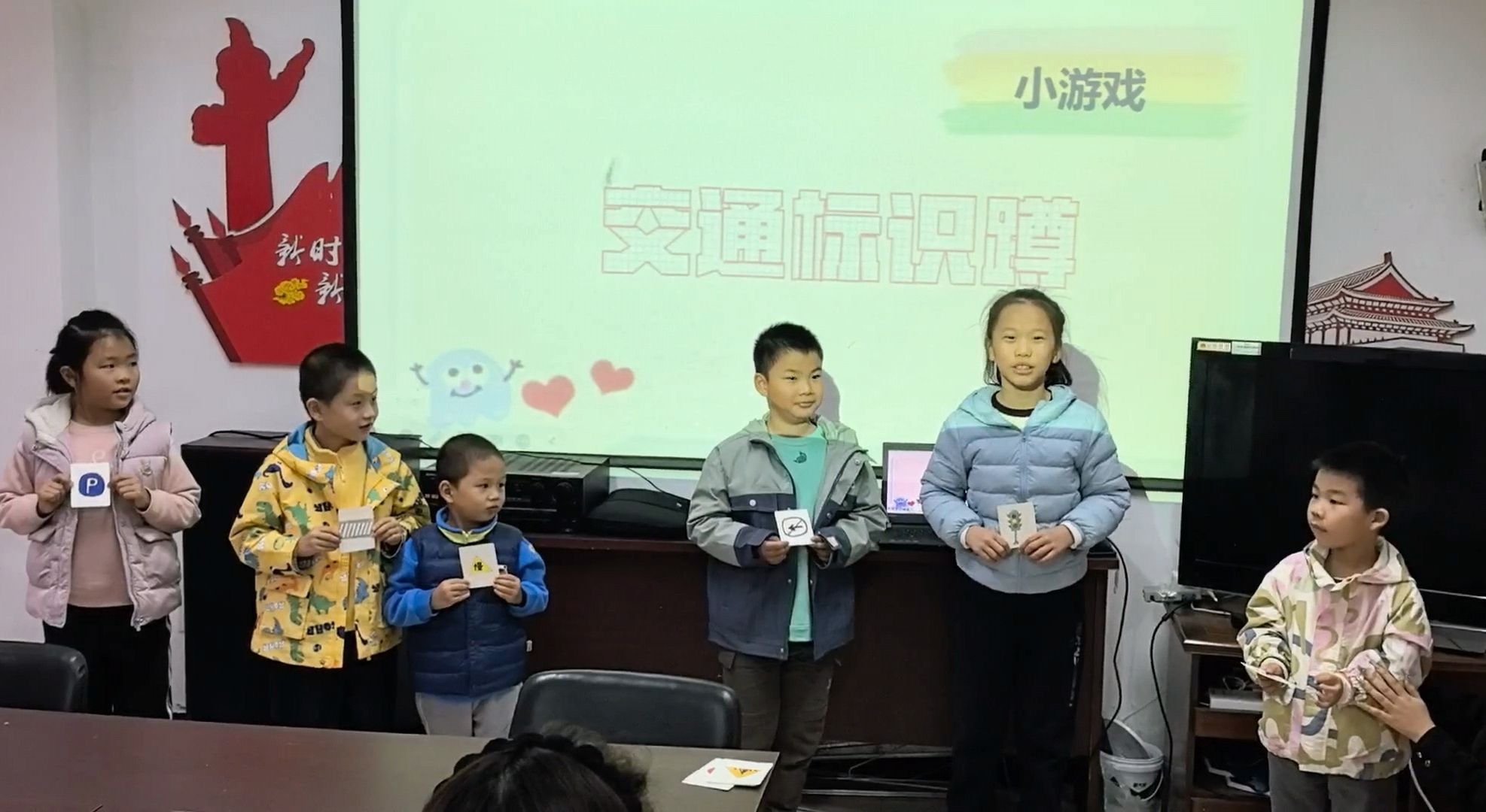 志愿者通过PPT展示红绿灯、斑马线、禁止通行等卡通交通标识,搭配“红灯停,绿灯行”等朗朗上口的口诀,帮助儿童快速识别3-4种常见交通标识。“交通标识蹲”游戏环节更是将气氛推向小高潮:孩子们随机抽取手绘标识卡片,听到“红绿灯蹲”指令后,持对应卡片的孩子需快速蹲下并接力喊话,做错的小朋友通过回答“过马路要走什么线”等问题补答,答对即可获得 “交通小达人”贴纸,贴在专属的“安全成长卡”上,在欢笑中记忆过马路核心规则。