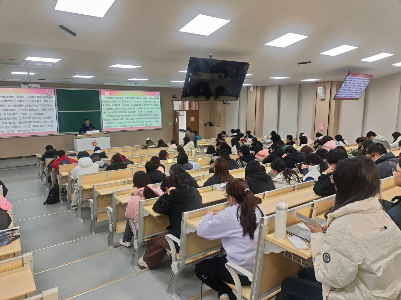 讲座中,葛处长借助详实的资料,从消防安全的重要性、潜在风险以及应对措施等维度,深度剖析了学生群体面临的消防安全状况。他特别提醒,学校人员密集,消防安全容不得半点马虎,同学们必须切实提升消防安全意识与应急能力。