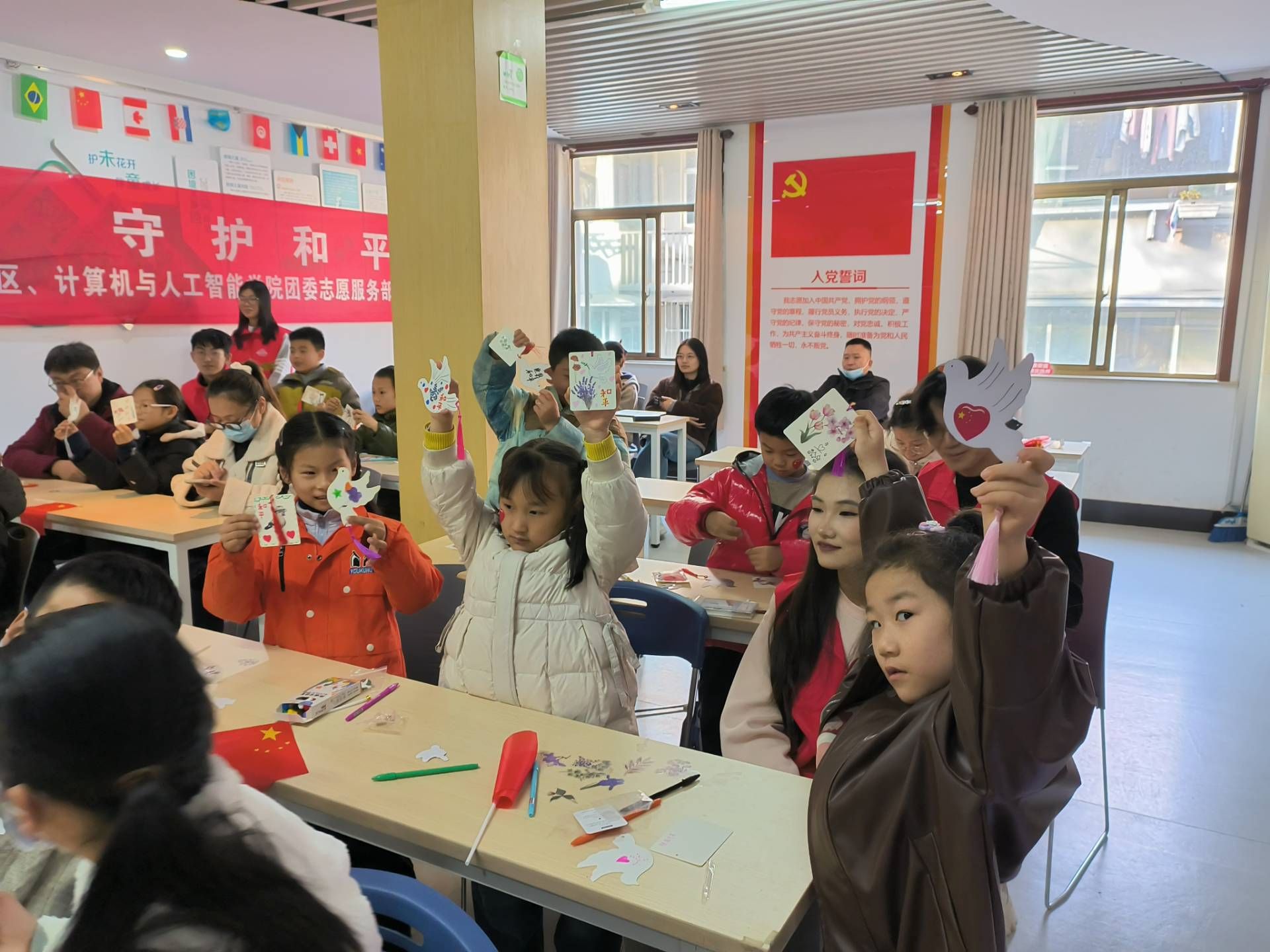 手工制作“和平书签”环节,让情感的流淌化为具象的表达。在志愿者一对一的耐心协助下,孩子们小心翼翼地裁剪卡纸,用心描绘和平鸽与橄榄枝,郑重写下“珍爱和平、铭记历史”的字样。彩笔划过,丝带穿引,一方方独一无二的书签逐渐成型。其中一位小朋友展示着他的心形书签,认真地说:“我想把它夹在书里,每次打开都能想起今天。”小小的书签,不仅是手工作品,更成为了承载历史记忆与未来期许的微小信物。