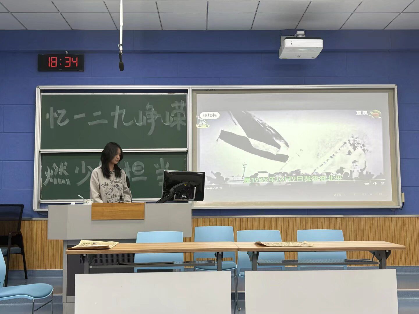随后,通过一段影片,同学们进一步领悟了“一二·九”精神的内涵与时代价值。生动的历史画面与激昂的配乐,将大家的思绪带回到那个风雨如晦的年代,激荡起对先辈的深切敬仰与对自身责任的深刻思考。