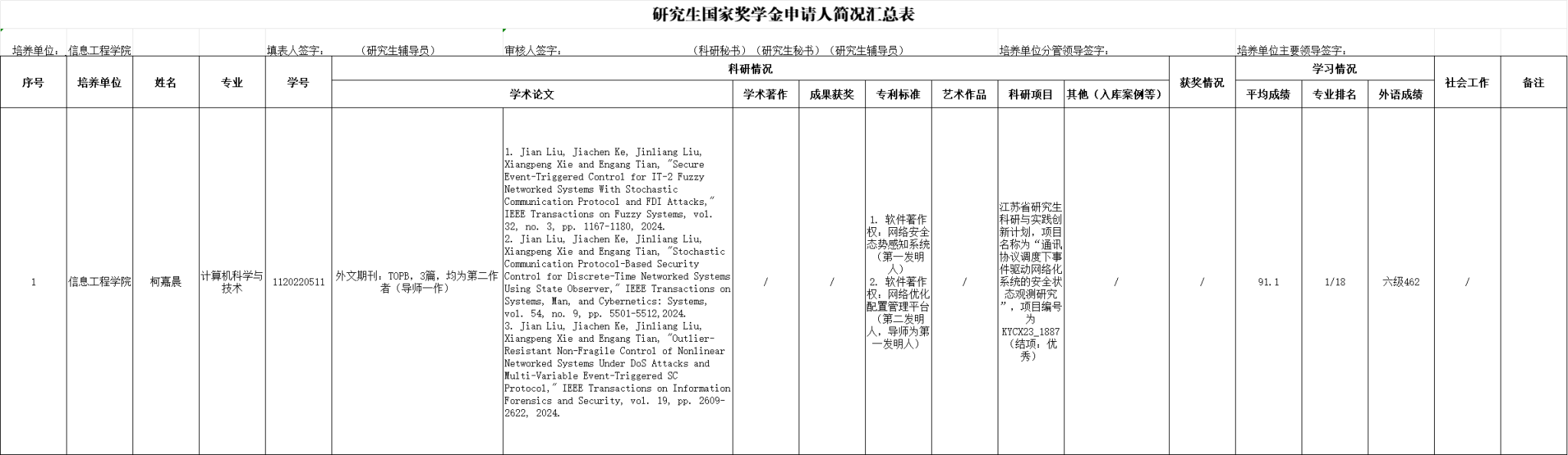 关于信息工程学院2024年研究生国家奖学金拟推荐名单的公示