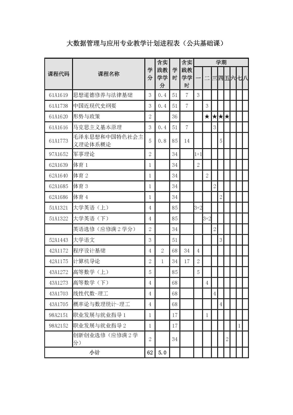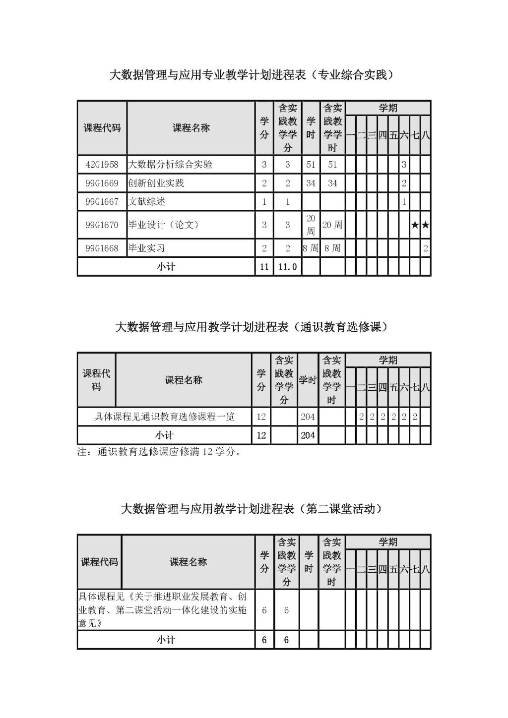 (一)公民素质与职业道德培养要求: 1.努力学习并掌握马列主义、毛泽东思想、邓小平理论、三个代表、科学发展观、习近平新时代中国特色社会主义思想等重要思想的精髓,指导自己的学习、实践和行动; 2.自觉维护国家利益,愿意为祖国社会主义现代化建设服务,为人民服务; 3.具有锐意进取、善于合作、百折不挠的意识、意志、毅力和精神; 4.模范遵守社会公德、法律、法规和职业道德; 5.尊重事实,敢于负责。 (二)知识与能力培养要求: 1.具备一定人文科学、社会科学和自然科学的基础知识与工程素养; 2.熟练掌握管理学的基本理论、基础知识和基本技能; 3.系统掌握互联网环境下电子商务大数据管理的各种常用技术和应用方法; 4.掌握各类大数据分析方法以及常用决策方法; 5.系统掌握大数据管理理论知识和相关实现技术; 6.掌握信息资源检索、资料查询的专业方法,具有获取网络信息的技能、再学习的能力和从事科学研究的初步能力; 7.熟练掌握计算机应用技术,具有较强的信息技术专业能力; 8.掌握一门外国语,具有本专业领域较强的外语综合应用能力; 9.具有较强的专业分析能力、语言表达能力、良好的沟通能力和组织协调能力。 (三)身体与心理素质培养要求: 1.掌握一定的体育基础知识; 2.掌握科学锻炼身体的基本技能; 3.具有良好的体育锻炼和卫生习惯,身体健康; 4.掌握一定的心理学基础知识、技能和方法; 5.尊重生命,关爱他人; 6.理性、严谨,乐观、开朗。