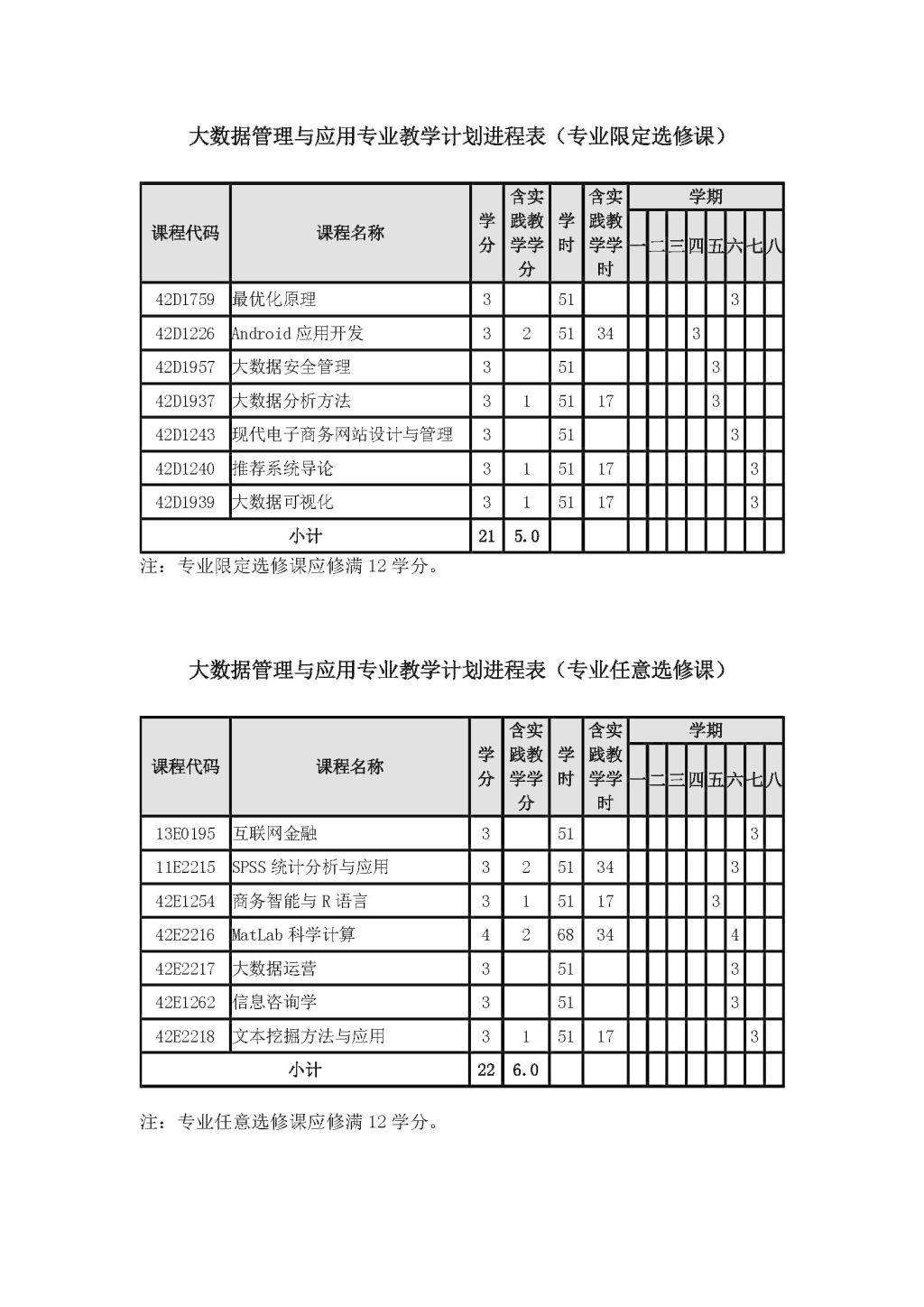 总体课程设置强调数据科学与信息技术的结合和复合应用,具体包括管理运筹学、最优化原理、计量经济学、数据分析基础、大数据存储与处理、大数据管理、大数据分析方法、大数据开发课程设计、大数据安全管理、大数据分析方法、大数据可视化、Python及数据分析应用、信息检索原理、推荐系统导论、现代电子商务网站设计与管理、商务智能与R语言、互联网金融、移动电子商务等。